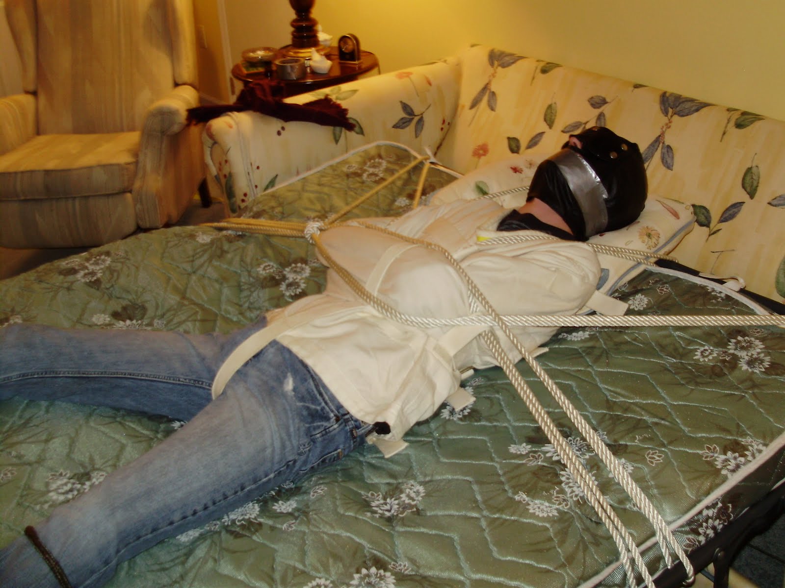 After I released him from the straight jacket, where he was in it for well over an hour (his first straight jacket ride, what a Champ), we downloaded the pics and both rehydrated. After about a half an hour, he was ready to go back into the hood and straight jacket, of course still wearing the 75th anniversary Sperry Topsider CVO Canvas Sneakers.. This time, I secured to the sofa bed, with soft medical restraints for the ankles, and rope to secure the legs and the chest. We tried some gags, but his mouth was to small for the ball gag, he did not like the scarf gag, but loved the duct tape gag. He simmered like this for about a hour and fifteen minutes, with him experiencing a very nice climax.