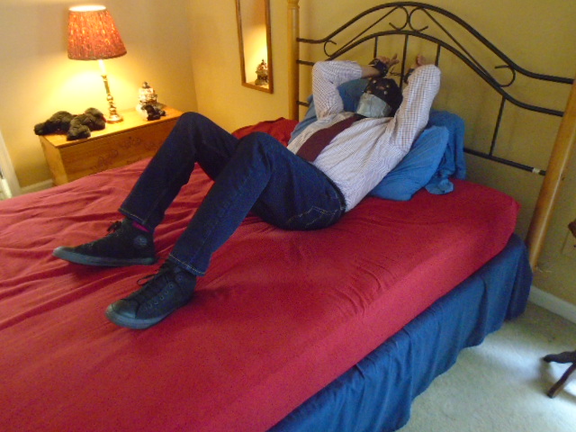 It was now time to be secured to the bed for relaxation, and to see if I could hold out one hour, which I was able to accomplish. Of course I enjoyed being hard inside my Levis the entire time.