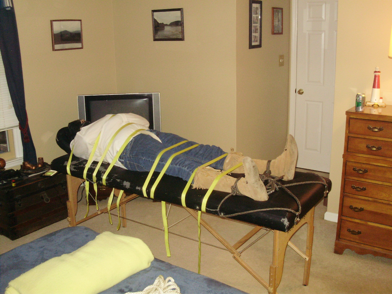 Here are two more scenes I did where I got tied in the Straight Jacket and Massage Table. One was in LL Bean Duck Boots, and one was in soft soled Minnetonka Suede Indian Boots and a third in the Xtratuf Rubber Boots. More hot times!