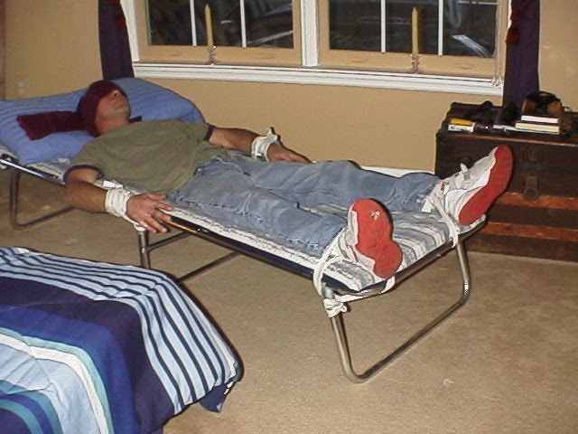 After about an hour, I returned to release him. He said that with the blindfold and hood, there was total darkness. Once the binural beats starting playing, he said he slipped into a nice head space seeing different colors through out the time he was tied up, and actually felt like he just slipped off into another world, which he was finding very peaceful. He was not fed pot or poppers either before being tied up, or while he was tied up.